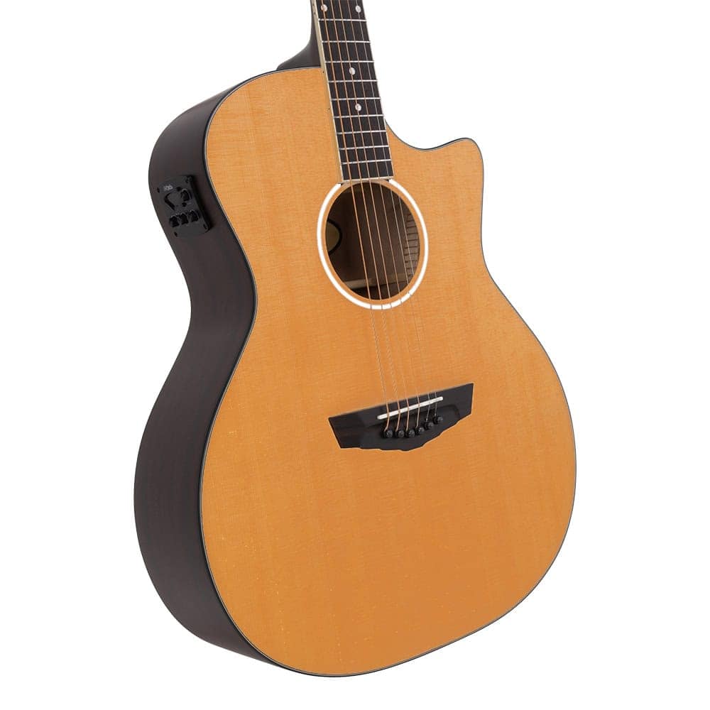 D’Angelico Premier Gramercy Vintage Natural, chitara electro-acustica cu o dimensiune a corpului deosebit de confortabila si un profil subtire al gatului in forma de „C”. Tonul sau cald si echilibrat este clar pe toate cele 6 corzi, in timp ce preamplificatorul si tunerul integrate simplifica amplificarea si performanta pe scena.