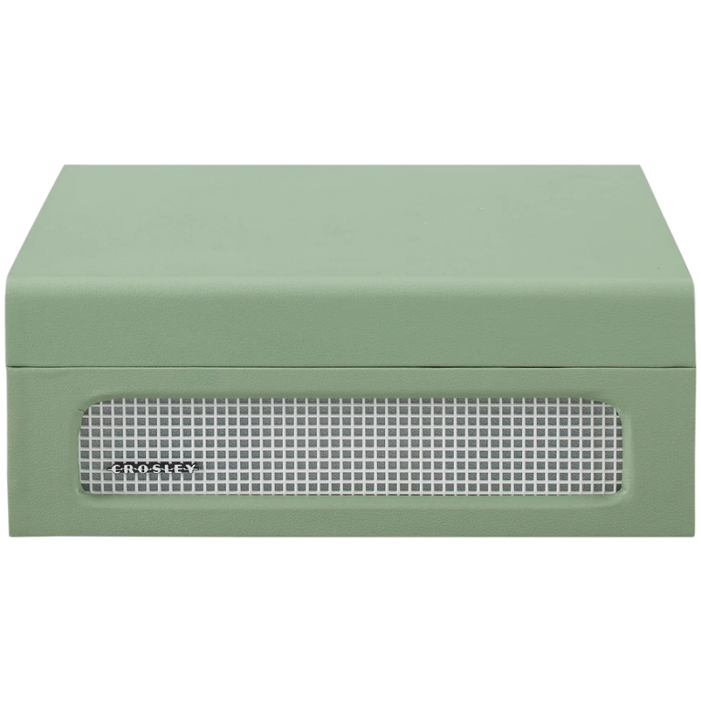 Pickup Bluetooth Crosley Voyager CR8017B-SA, Sage, design de servietă, cu grilaj elegant in față, două difuzoare situate în spate așteptând ca volumul să fie mărit.
