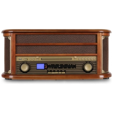 Sistem Audio Vintage Belle Epoque 1908 MP3 USB FM Radio – sistem Retro Micro cu tuner radio AM / FM, difuzoare stereo si functia de înregistrare, finisaj lemn masiv, Phono – placa turnanta cu transmisie prin curea si sistem start-stop, CD – unitate integrata CD pentru redarea CD-uri audio, USB – pentru conectare MP3-stick-uri USB si MP3 playere,casetofon integrat pentru redarea de casete audio.